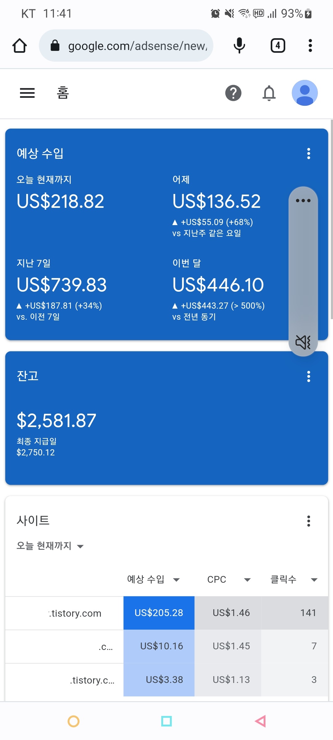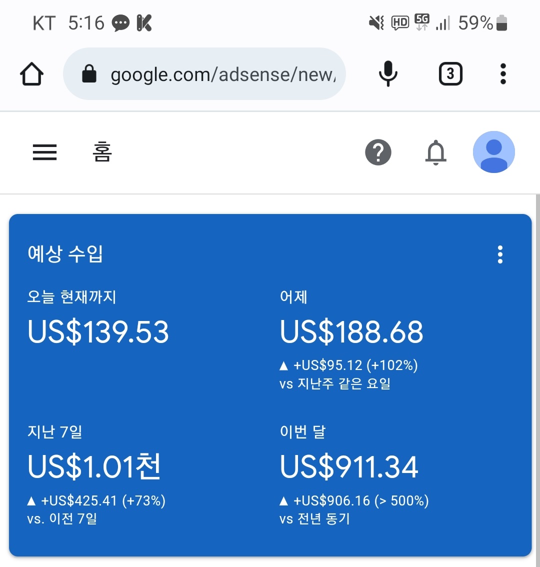 요즘 크롤러 오류와 주력 블로그 하나가 저품질을 맞고 그나마 월 300만원 이상은 유지 중이네요. 하도 사기 친다는 사람들이 많아 핸드폰 애드센스 수익 캡처하여 올려 봅니다. 자랑하는게 아닙니다. 볼르고 수익화, 애드센스 고수익 누구나 가능합니다. 저보다 훨씬더 애드센스 수익 많이 내는 분들도 많습니다. 아래 사진은 4월3일입니다. 즉 4월 시작하고 3일째 마무리 시점인데요 출발이 좋습니다.