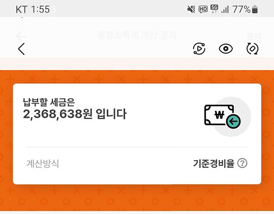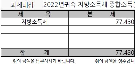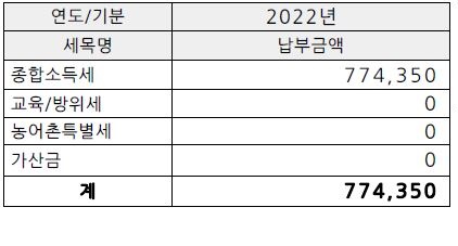 - 최종 납부 세액 : 종합소득세 774,350 + 지방세납부 77,430